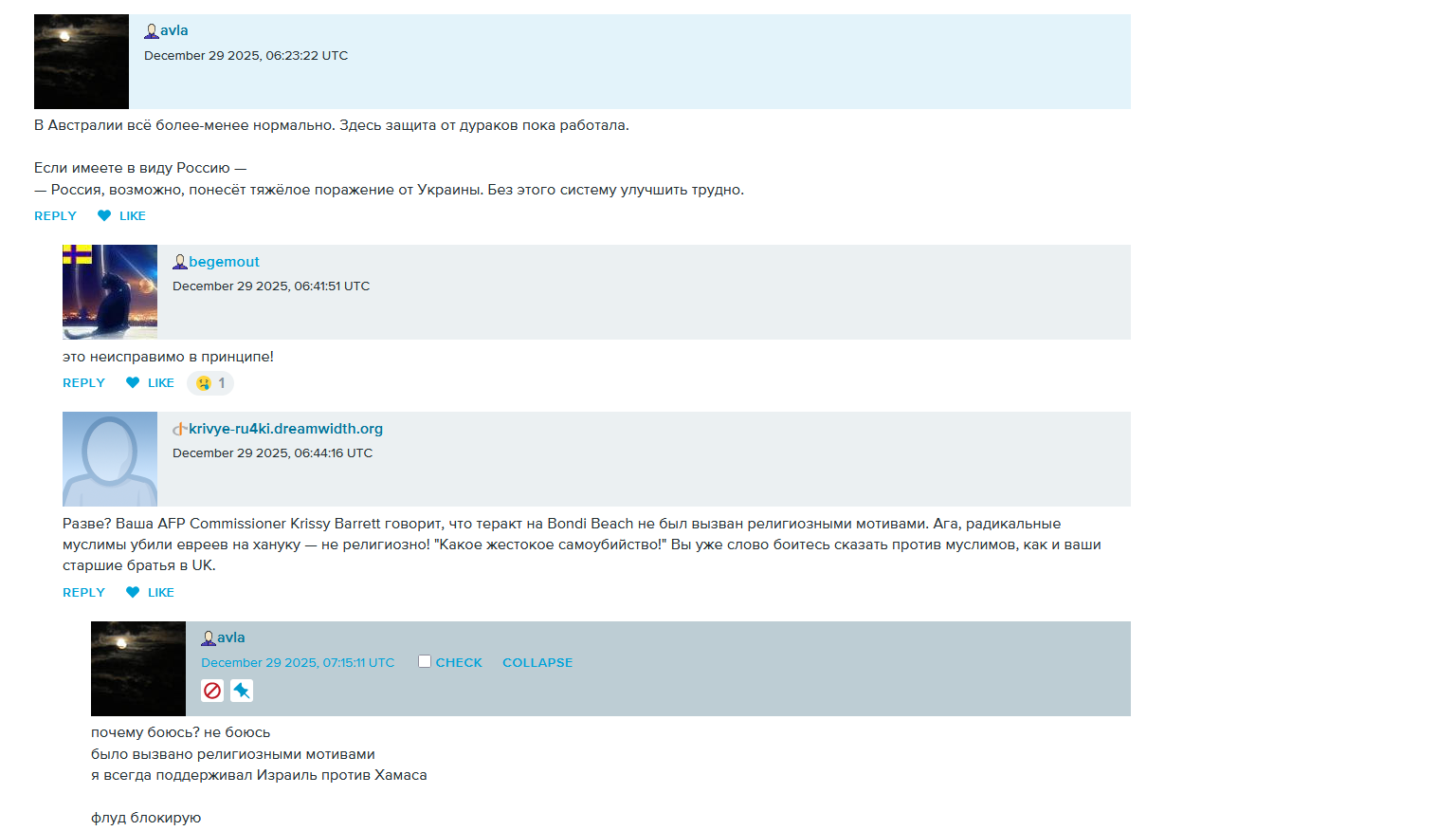 Dec. 29th, 2025 02:49 amКогда Авле задали вопрос: когда Украина голосует вместе с просвещённой Европой против Израиля и США - он за какую сторону, Avla этот вопрос не просто заморозил, но удалил камент и забанил вопрошающего. Это значит, что ответ на вопрос он знает, но он ему не нравится. Но другой альтернативы он не видит в принципе. И в этом же посте он продвигает диктатуру в стиле киберпанка - сначала лишить половину населения избирательных прав, потому что проголосовали не за того. Потом вообще вживить всем чипы совести и контролировать удалённо. У постсоветского антитрампистского интеллигента (именно пост, в совке находились те, кто публиковали, например, "Бабий Яр" Евтушенко), как в том анекдоте, что бы он ни собирал, а получается пулемёт тоталитаризм.